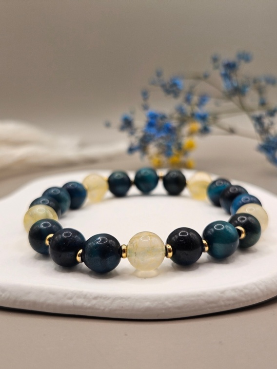 Mocna i wyrazista – sokole oko to kamień jasności myśli, intuicji i odwagi. Pomaga patrzeć szerzej i z dystansem. Cytryn wzmacnia wiarę w siebie, przyciąga sukces, radość i dobrą energię. Razem tworzą silne połączenie dla tych, którzy chcą działać świadomie i z lekkością.