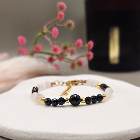 Kamienie: Turmalin, onyks, kwarc różowy, kamień księżycowy